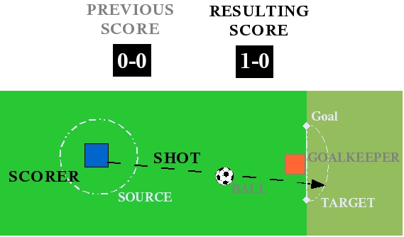 A goalThe goal scenario is centered around the event of the ball passing over the goal line between the goalposts and under the crossbar. The main protagonist of the scenario is the scorer. The scorer scores the goal with a shot, i.e. by directing the ball from a source location on the field to a target location inside the opponent's goal, using a part of his body. In doing so, the scorer has to find a way to put the ball past the opponent's goalkeeper As a result of the goal, the previous score changes to the resulting score such that the figure designating the number of goals the scorer's team has scored is augmented by one.